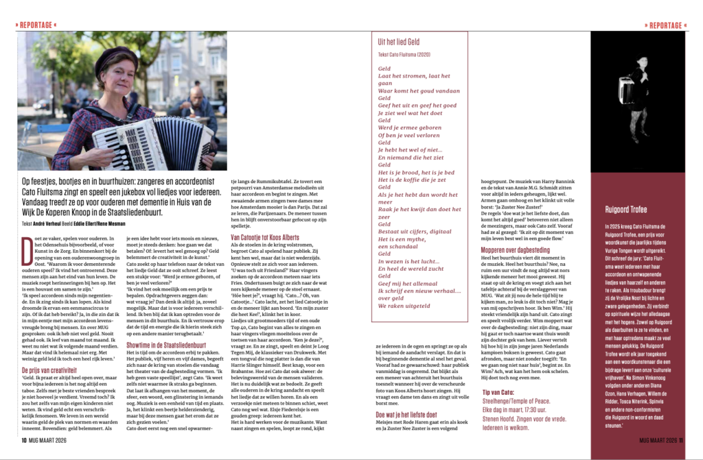 In maart 2026 verscheen in het Amsterdamse stadsmagazine MUG een reportage over mijn werk als zangeres en accordeonist. Journalist André Verheul kwam luisteren bij een middag zingen met ouderen met dementie in Huis van de Wijk De Koperen Knoop.